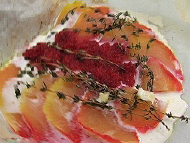 Десерт из манго с малиной.Состав:манго — 100 гр;малина — 50 гр;нежирный сливки — 100 гр;мандариновое масло — 1/2 столовой ложки;тимьян, смесь перцев — по вкусу.