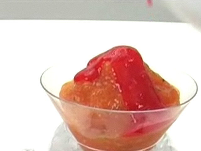 Вкусный десерт из папайи и малины. 193 калории.Состав:сахар — 1/2 стакана;папайя — 1 штука;лайм — 1 штука;вода — 1/2 стакана;малина — 60 гр;мята.
