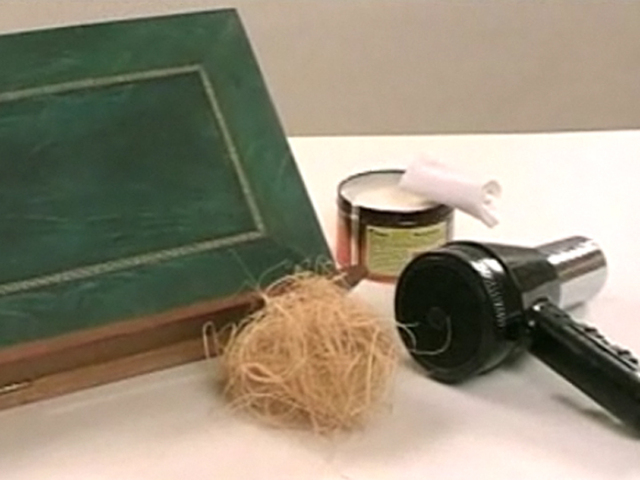 Нам потребуется:деревянное изделие, ткань, воск, фен, волокна травы.